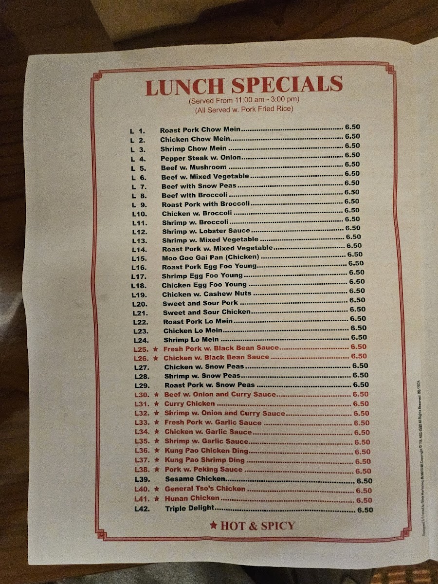 From a reviewer’s perspective, the lunch menu at Holy Wong Chinese in Dunkirk leaves a clear and satisfying impression thanks to its focus on familiar, well-loved Chinese-American classics. The Lunch Specials highlight hearty, comfort-driven options that cater to both meat lovers and those looking for balanced flavors. Dishes like Roast Pork Chow Mein, Chicken Chow Mein, and Shrimp Chow Mein showcase the restaurant’s strength in stir-fried noodle dishes, offering different protein choices while maintaining that expected savory, wok-finished taste. For diners who prefer rice-free entrées with bold sauces, selections such as Pepper Steak W. Onion stand out with their combination of tender beef and aromatic onions, while Beef W. Mushroom delivers a more earthy, umami-rich profile. Altogether, this concise lunch menu reflects a practical and approachable selection, ideal for a quick midday meal that still feels filling and flavorful. As a conclusion, Holy Wong Chinese’s lunch offerings successfully summarize what the restaurant does best: straightforward Chinese comfort food, recognizable dishes, and reliable variety that appeals to a wide range of tastes.